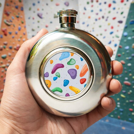 Okrúhla nerezová ploskačka s obrázkom chytov na lezeckej stene.